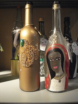 Christine loves what she does because she has the capability to turn items that would have ended up in a river or the sea, or land fill into something that can be re-used and appreciated. This includes toilet paper rolls and even pieces of carnival costumes. Specific to her love of bottle art, she does not like to duplicate her designs, so most of her hand-painted bottles are originals. She professes to love glass bottles, not only because they can be hand-painted and made into jewelry, but also because they can be re-cycled by everyone. She refers to herself as the bottle lady so to speak.