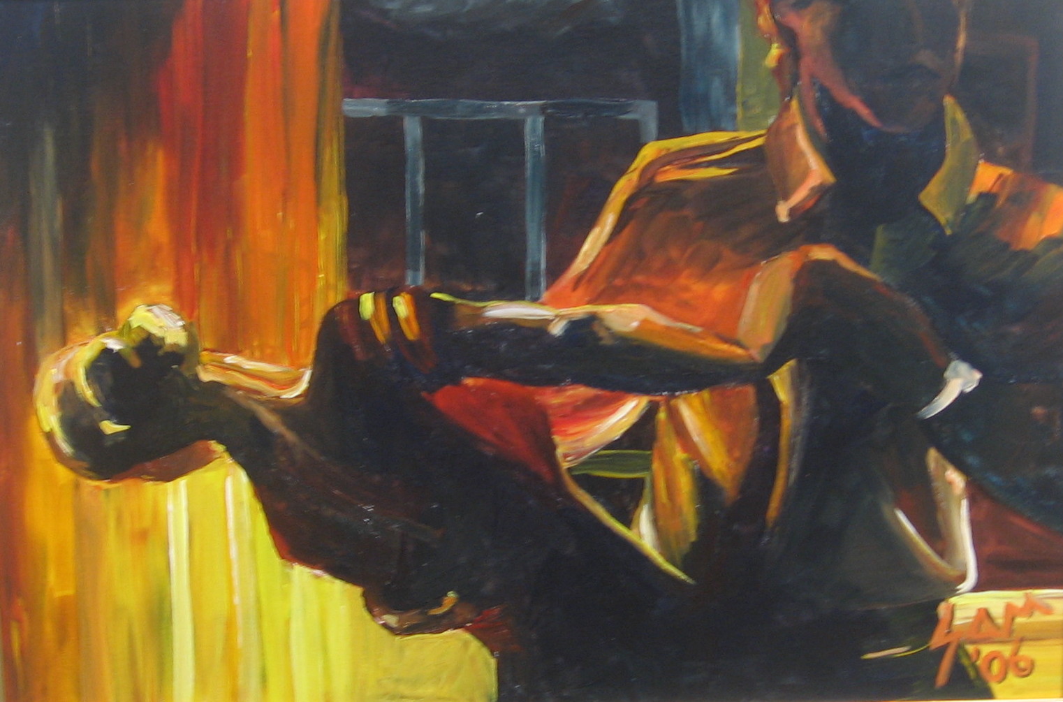Sam is currently working on a series of women. “ These women are the manifestations of my thoughts on these emotions. The women are reflections of me and female personalities around me that intrigue me in some way. Their body language conveys and emotion, or happening at a point in time.” I tend to paint subjects which have a slight taboo, because I believe they are misunderstood, and scorned because of this. Sensuality is one main theme. I think too many women are made to feel apologetic because they exude sensuality. “